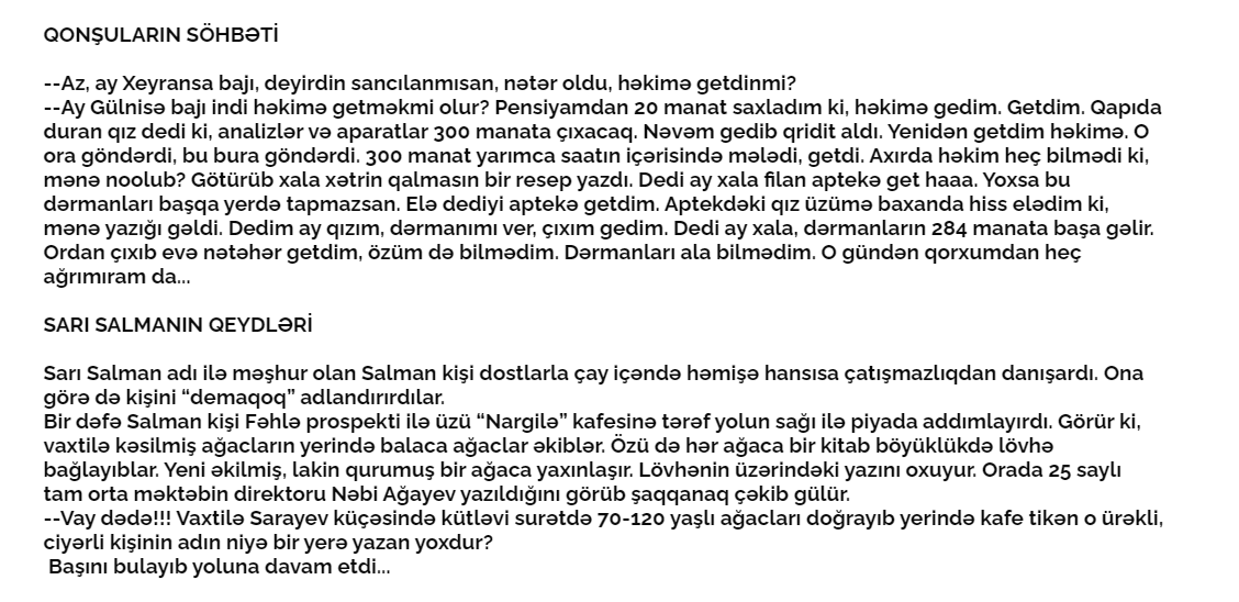 --Ay Gülnisə bajı indi həkimə getməkmi olur? Pensiyamdan 20 manat saxladım ki, həkimə gedim. Getdim. Qapıda duran qız dedi ki, analizlər və aparatlar 300 manata çıxacaq. Nəvəm gedib qridit aldı. Yenidən getdim həkimə. O ora göndərdi, bu bura göndərdi. 300 manat yarımca saatın içərisində mələdi, getdi. Axırda həkim heç bilmədi ki, mənə noolub? Götürüb xala xətrin qalmasın bir resep yazdı. Dedi ay xala filan aptekə get haaa. Yoxsa bu dərmanları başqa yerdə tapmazsan. Elə dediyi aptekə getdim. Aptekdəki qız üzümə baxanda hiss elədim ki, mənə yazığı gəldi. Dedim ay qızım, dərmanımı ver, çıxım gedim. Dedi ay xala, dərmanların 284 manata başa gəlir. Ordan çıxıb evə nətəhər getdim, özüm də bilmədim. Dərmanları ala bilmədim. O gündən qorxumdan heç ağrımıram da...